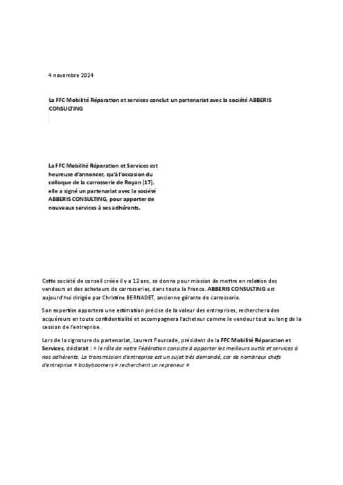 Services 04 novembre 2024 - 16:12 La FFC Mobilité Réparation et Services est heureuse d’annoncer, qu’à l’occasion du colloque de la carrosserie de Royan (17), elle a signé un partenariat avec la société ABBERIS CONSULTING, pour apporter de nouveaux services à ses adhérents. PDF (137 Ko) Télécharger Crédits : FFC Mobilité