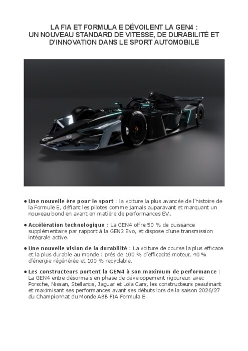Formula E et la Fédération Internationale de l’Automobile (FIA) ont aujourd’hui dévoilé la toute nouvelle voiture de course GEN4, marquant une réinvention du sport automobile et le prochain chapitre du sport électrique. Capable d’atteindre des vitesses fulgurantes, la voiture la plus rapide de l’histoire du Championnat du Monde ABB FIA Formula E a été conçue pour les pionniers d’aujourd’hui et les talents de demain, établissant un nouveau standard en matière d’innovation, de vitesse et de durabilité.