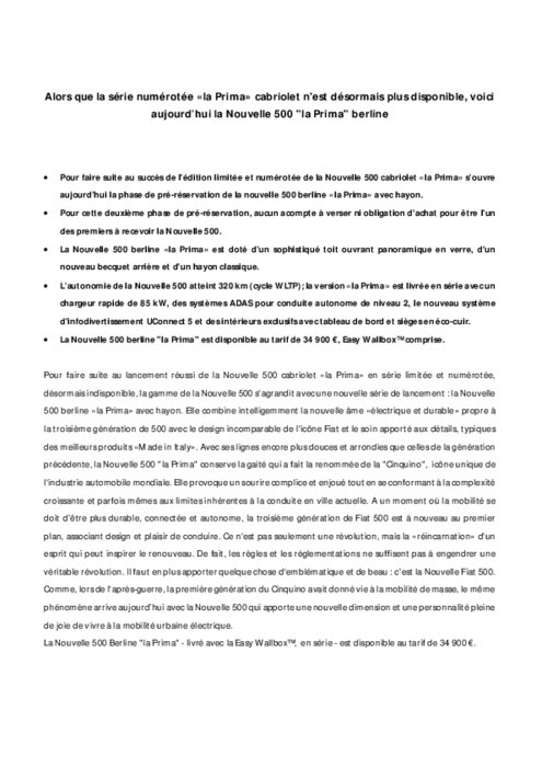 Pour faire suite au lancement réussi de la Nouvelle 500 cabriolet "la Prima", série limitée dont la version numérotée est désormais indisponible, la gamme de la Nouvelle 500 s'agrandit avec une nouvelle série de lancement : la Nouvelle 500 berline "la Prima" avec hayon. Elle combine intelligemment la nouvelle âme "électrique et durable" propre à la troisième génération de 500 avec le design incomparable de l'icône Fiat et le soin apporté aux détails, typiques des meilleurs produits italiens...