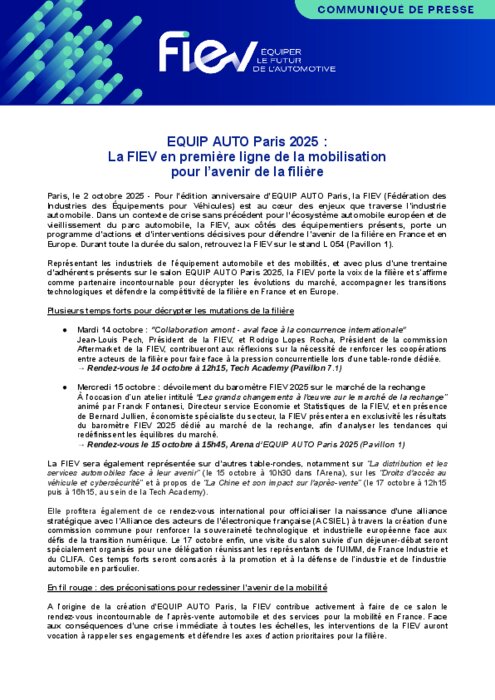 Pour l'édition anniversaire d'EQUIP AUTO Paris, la FIEV (Fédération des Industries des Équipements pour Véhicules) est au coeur des enjeux que traverse l’industrie automobile. Dans un contexte de crise sans précédent pour l'écosystème automobile européen et de vieillissement du parc automobile, la FIEV, aux côtés des équipementiers présents, porte un programme d’actions et d’interventions décisives pour défendre l’avenir de la filière en France et en Europe. Durant toute la durée du salon, retrouvez la FIEV sur le stand L 054 (Pavillon 1).