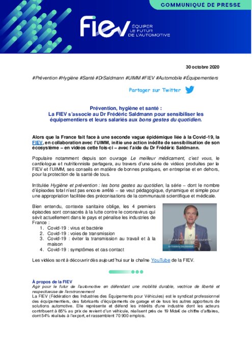 Services 30 octobre 2020 - 15:16 Alors que la France fait face à une seconde vague épidémique liée à la Covid-19, la FIEV, en collaboration avec l'UIMM, initie une action inédite de sensibilisation de son écosystème – en vidéos cette fois-ci – avec l'aide du Dr Frédéric Saldmann. PDF (241 Ko) Télécharger