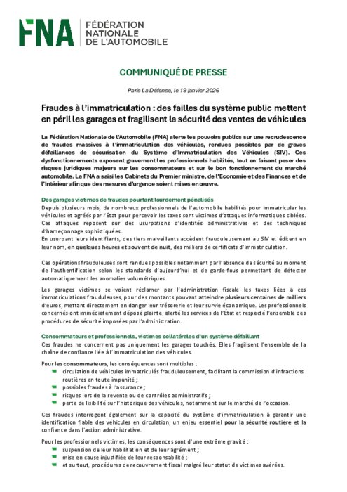 La Fédération Nationale de l’Automobile (FNA) alerte les pouvoirs publics sur une recrudescence de fraudes massives à l’immatriculation des véhicules, rendues possibles par de graves défaillances de sécurisation du Système d’Immatriculation des Véhicules (SIV). Ces dysfonctionnements exposent gravement les professionnels habilités, tout en faisant peser des risques juridiques majeurs sur les consommateurs et sur le bon fonctionnement du marché automobile.