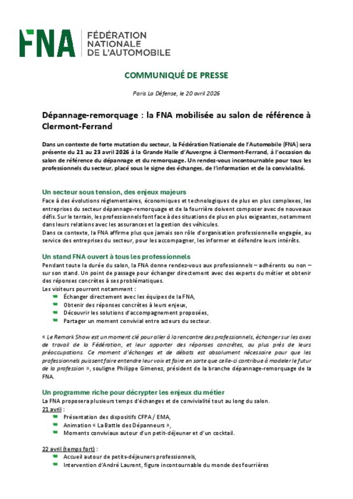 À l’occasion du salon Remork Show du 21 au 23 avril à Clermont-Ferrand, la Fédération Nationale de l’Automobile sera présente pour échanger avec les professionnels du dépannage-remorquage autour des principaux enjeux du secteur. Relations avec les assurances, gestion des véhicules volés et retrouvés (VVR), contraintes juridiques et réglementaires… autant de sujets qui seront au cœur des échanges.