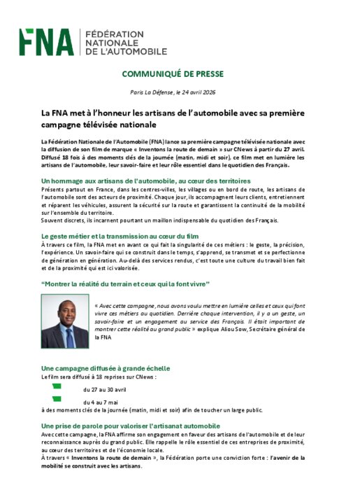 La Fédération Nationale de l’Automobile (FNA) lance sa première campagne télévisée nationale avec la diffusion de son film de marque « Inventons la route de demain » sur cnews à partir du 27 avril. Diffusé 18 fois à des moments clés de la journée (matin, midi et soir), ce film met en lumière les artisans de l’automobile, leur savoir-faire et leur rôle essentiel dans le quotidien des Français.