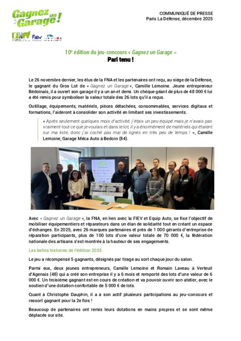 Le 26 novembre dernier, les élus de la FNA et les partenaires ont reçu, au siège de la Défense, le gagnant du Gros Lot de « Gagnez un Garage », Camille Lemoine. Jeune entrepreneur Bédoinais, il a ouvert son garage il y a un an et demi. Un chèque géant de plus de 48 000 € lui a été remis pour symboliser la valeur totale des 26 lots qu’il a reçus.