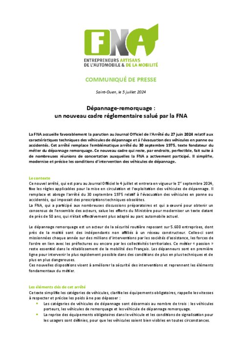 La FNA accueille favorablement la parution au Journal Officiel de l'Arrêté du 27 juin 2024 relatif aux caractéristiques techniques des véhicules de dépannage et à l'évacuation des véhicules en panne ou accidentés. Cet arrêté remplace l’emblématique arrêté du 30 septembre 1975, texte fondateur du métier du dépannage remorquage.