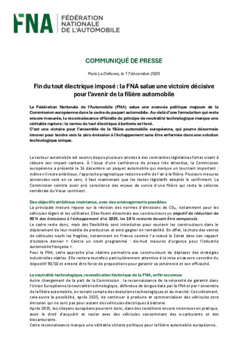 La Fédération Nationale de l’Automobile (FNA) salue une avancée politique majeure de la Commission européenne dans le cadre du paquet automobile. Au-delà d’une formulation qui reste encore mesurée, la reconnaissance officielle du principe de neutralité technologique marque une véritable rupture : le verrou du tout électrique à batterie est levé. C’est une victoire pour l’ensemble de la filière automobile européenne, qui pourra désormais innover pour tendre vers le zéro émission à l’échappement sans être enfermée dans une solution technologique unique.