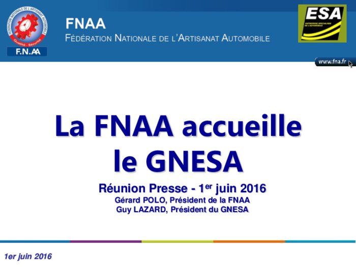 Grâce à son partenariat avec le GNESA, la FNAA renforce sa représentativité. La FNAA, 2ème O.P. des services de l’automobile, s’est organisée structurellement et statutairement pour accueillir d’autres organisations professionnelles. La FNAA a jeté les bases d’un projet commun, modulable en fonction des spécificités des éventuelles O.P. arrivantes. Parallèlement, elle a entamé une réflexion de fond sur les attentes des professionnels de la filière.