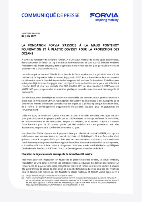 A travers sa Fondation d’entreprise, FORVIA, 7e fournisseur mondial de technologies automobiles, étend son action en faveur de la protection de l’environnement en s’associant à la Maud Fontenoy Foundation et à Plastic Odyssey, deux organisations de renom dédiées plus particulièrement à la protection de la biodiversité marine.