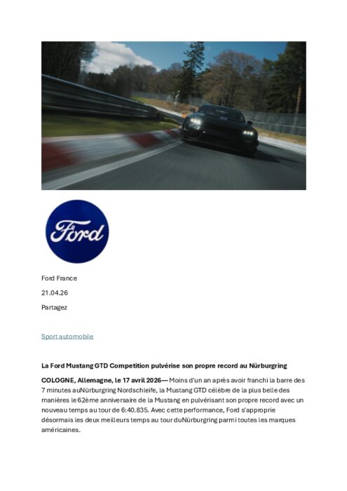 Moins d'un an après avoir franchi la barre des 7 minutes au Nürburgring Nordschleife, la Mustang GTD célèbre de la plus belle des manières le 62ème anniversaire de la Mustang en pulvérisant son propre record avec un nouveau temps au tour de 6:40.835. Avec cette performance, Ford s'approprie désormais les deux meilleurs temps au tour du Nürburgring parmi toutes les marques américaines.