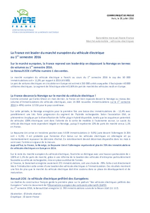Le marché européen du véhicule électrique a franchi au cours du 1er semestre 2016 le cap des 50 000 immatriculations soit +11,3% par rapport à 2015 (45 500). Le parc de voitures électriques en circulation en Europe est estimé à 253 000 unités auxquelles il faut ajouter 40 000 utilitaires électriques. Le segment de l'électrique atteint 0,56% de part de marché des véhicules neufs en Europe.