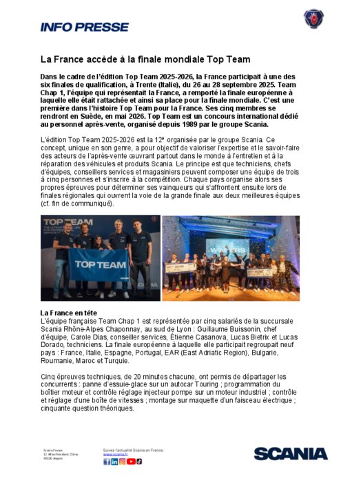 Dans le cadre de l’édition Top Team 2025-2026, la France participait à une des six finales de qualification, à Trente (Italie), du 26 au 28 septembre 2025. Team Chap 1, l’équipe qui représentait la France, a remporté la finale européenne à laquelle elle était rattachée et ainsi sa place pour la finale mondiale. C’est une première dans l’histoire Top Team pour la France. Ses cinq membres se rendront en Suède, en mai 2026. Top Team est un concours international dédié au personnel après-vente, organisé depuis 1989 par le groupe Scania.