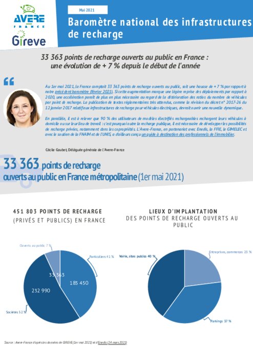 Au 1er mai 2021, la France comptabilisait 33 363 points de recharge ouverts au public. Cela représente une évolution de + 7 % par rapport à notre précédent baromètre de février 2021. Si la hausse peut paraître faible, notamment au regard de la détérioration des ratios du nombre de véhicules électriques par point de recharge, la révision du décret n° 2017-26 du 12 janvier 2017 relatif aux infrastructures de recharge pour véhicules électriques devrait permettre d'intensifier les déploiements.