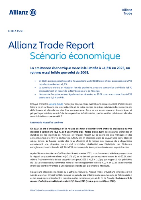 Chaque trimestre, Allianz Trade met à jour son scénario macroéconomique mondial. L’occasion de faire le point sur l’économie internationale, et de présenter ses dernières prévisions de croissance, de défaillances et d’évolution des flux commerciaux. La croissance économique mondiale limitée à +1,5% en 2023, un rythme aussi faible que celui de 2008.