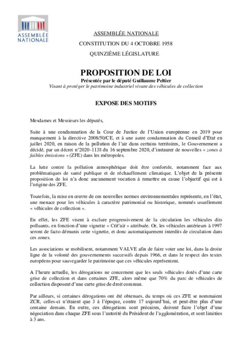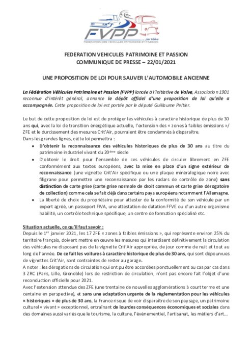 La Fédération Véhicules Patrimoine et Passion (FVPP) / Valve annonce le dépôt officiel d'une proposition de loi dont elle a accompagné la rédaction. Le but de cette proposition de loi, portée par le député Guillaume Peltier, est de protéger les véhicules à caractère historique de plus de 30 ans qui, avec la loi de transition énergétique actuelle, l'extension des « zones à faibles émissions » / ZFE et le durcissement des mesures Crit'Air, pourraient disparaître du paysage français.