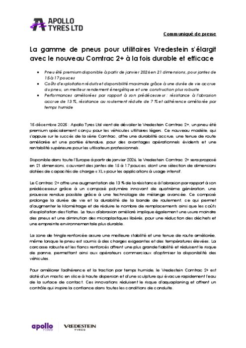 Apollo Tyres Ltd vient de dévoiler le Vredestein Comtrac 2+, un pneu été premium spécialement conçu pour les véhicules utilitaires légers. Ce nouveau modèle, qui s'appuie sur le succès de la série Comtrac, offre une durabilité accrue, une tenue de route améliorée et une portée étendue, pour des avantages opérationnels évidents et une rentabilité supérieure pour les utilisateurs professionnels.