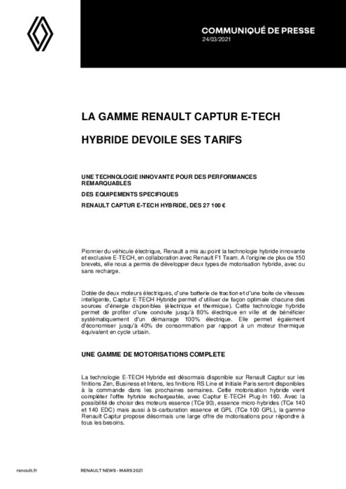 Pionnier du véhicule électrique, Renault a mis au point la technologie hybride innovante et exclusive E-TECH, en collaboration avec Renault F1 Team. A l’origine de plus de 150 brevets, elle nous a permis de développer deux types de motorisation hybride, avec ou sans recharge...