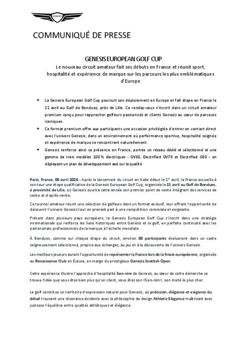 La Genesis European Golf Cup poursuit son déploiement en Europe et fait étape en France le 11 avril au Golf de Bondues, près de Lille. Ce rendez‑vous s’inscrit dans un circuit amateur premium conçu pour rapprocher golfeurs passionnés et clients Genesis au cœur de parcours iconiques.