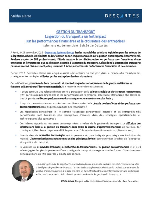Descartes Systems Group, leader mondial des solutions logicielles pour les acteurs de la logistique, dévoile les résultats de la 6e édition de son enquête annuelle sur la gestion du transport à l’international. Réalisée auprès de 285 professionnels, l’étude montre la corrélation entre les performances financières d’une entreprise et l’importance que sa direction accorde à la gestion du transport.