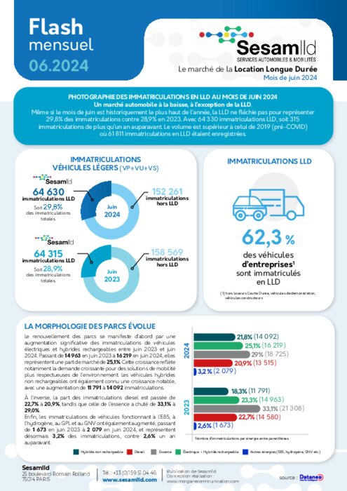 Même si le mois de juin est historiquement le plus haut de l’année, la LLD ne fléchit pas pour représenter 29,8% des immatriculations contre 28,9% en 2023. Avec 64 330 immatriculations LLD, soit 315 immatriculations de plus qu’un an auparavant. Le volume est supérieur à celui de 2019 (pré-COVID) où 61 811 immatriculations en LLD étaient enregistrées.