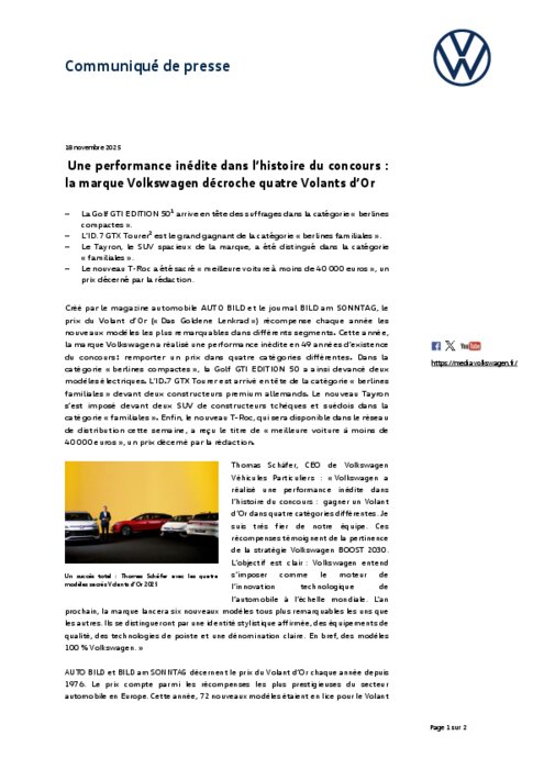 Créé par le magazine automobile Auto Bild et le journal Bild am Sonntag, le prix du Volant d'Or (« Das Goldene Lenkrad ») récompense chaque année les nouveaux modèles les plus remarquables dans différents segments. Cette année, la marque Volkswagen a réalisé une performance inédite en 49 années d'existence du concours : remporter un prix dans quatre catégories différentes.