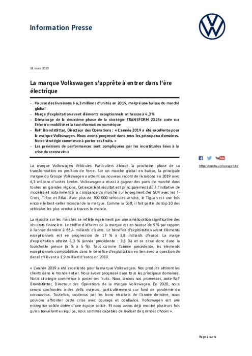 Malgré la situation actuelle liée à la crise du coronavirus, Volkswagen a décidé de lancer la deuxième phase de sa stratégie TRANSFORM 2025+, qui marque l'entrée dans une nouvelle ère pour la marque. L'initiative d'électrification à grande échelle sera dorénavant aussi visible sur les routes. Les livraisons de l'ID.3, premier modèle 100 % électrique basé sur la nouvelle plateforme électrique MEB, devraient débuter cet été. Puis viendra le premier SUV 100 % électrique de la marque, l'ID.4...