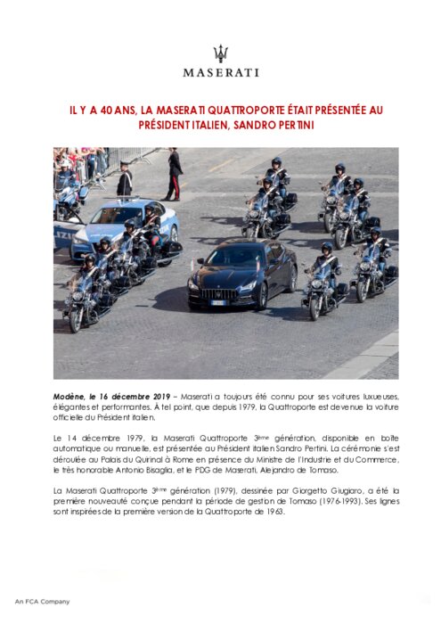 Maserati a toujours été connu pour ses voitures luxueuses, élégantes et performantes. À tel point, que depuis 1979, la Quattroporte est devenue la voiture officielle du Président italien. Le 14 décembre 1979, la Maserati Quattroporte 3ème génération, disponible en boîte automatique ou manuelle, est présentée au Président italien Sandro Pertini. La cérémonie s'est déroulée au Palais du Quirinal à Rome en présence du Ministre de l'Industrie et du Commerce, le très honorable Antonio Bisaglia...