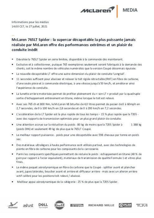McLaren annonce le nouveau chapitre de l'histoire de la "Longtail" qui a commencé il y a près d'un quart de siècle avec la victoire de la McLaren F1 GTR lors de la célèbre course du Mans. La McLaren 765LT Spider, dévoilée aujourd'hui, un modèle en série limitée de 765 unités dans le monde, accueille les caractéristiques qui distinguent l'ADN LT de McLaren : poids ultraléger, aérodynamisme amélioré, performances extrêmes et implication absolue du pilote...