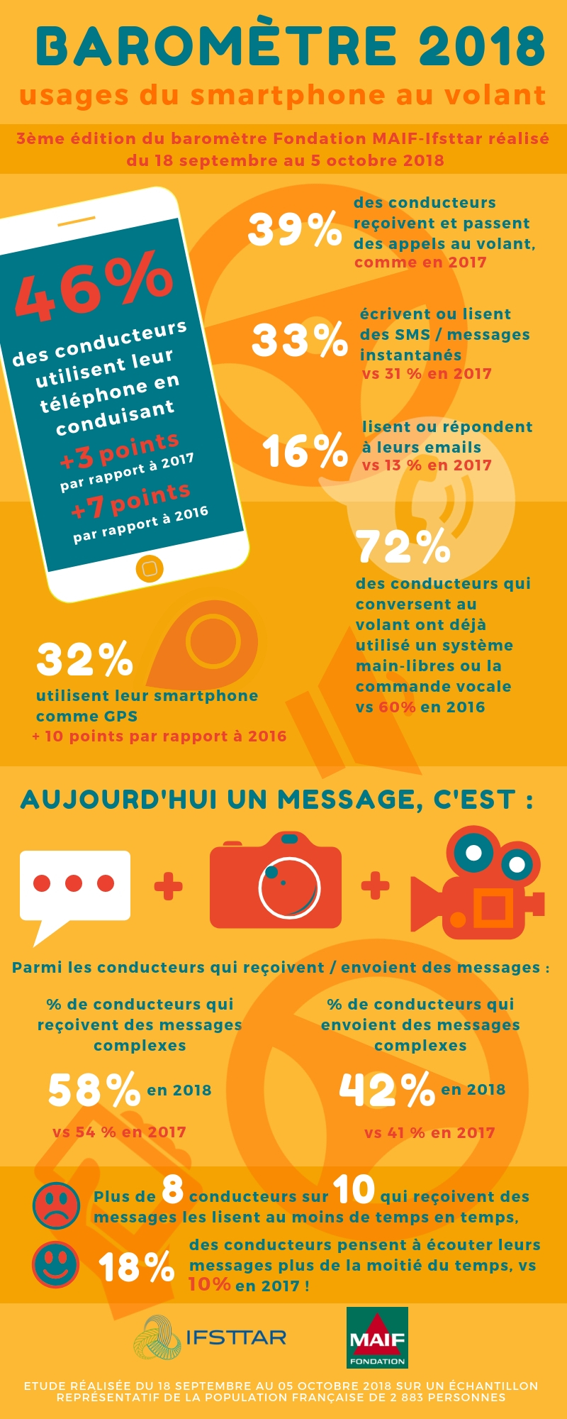 Les conversations stagnent en 2018 (39%), mais les autres usages se développent et deviennent prépondérants. Ils concernent 42% des sondés. L’usage des applications GPS bondit de 10 points en deux ans pour atteindre 32% en 2018. 34% des conducteurs consultent leurs messages au moins de temps en temps et 26% en envoient. Parallèlement, les messages se complexifient et combinent de plus en plus texte, image et/ou vidéo : une pratique très liée à l’âge qui concerne près de la moitié des jeunes conducteurs.