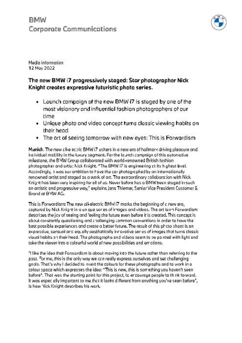 La campagne de lancement de la nouvelle BMW i7 est mise en scène par l'un des photographes de mode les plus visionnaires et influents de notre époque, Nick Knight. Un concept photo et vidéo unique qui bouleverse les habitudes visuelles classiques. L'art de voir demain avec un regard neuf : This is Forwardism.