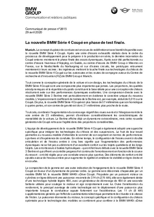 Un développement de pré-production approfondi pour la nouvelle génération du Coupé a été effectué sur les pistes et autres installations d'essai - La touche finale est maintenant apportée sur les routes de campagne et les autoroutes aux alentours du centre de recherche et d'innovation de BMW Group à Munich. Un concept global sur mesure et une configuration du châssis donnent un caractère sportif spécifique au nouveau modèle.