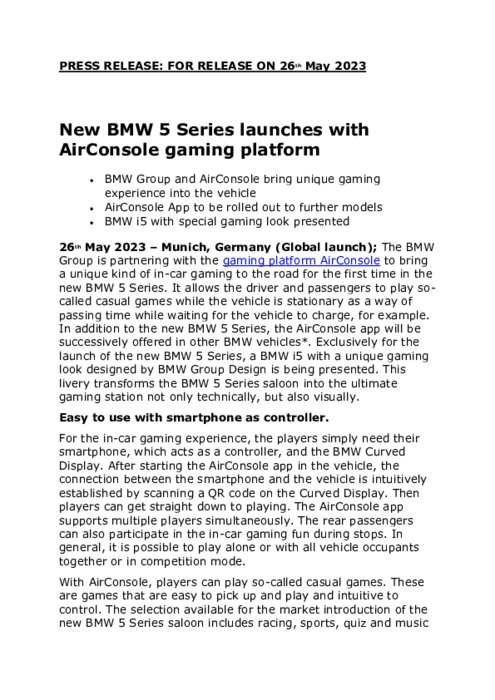 BMW Group s'associe à la plate-forme de jeu AirConsole pour apporter un type unique de jeu embarqué sur la route pour la première fois dans la nouvelle BMW Série 5. Il permet au conducteur et aux passagers de jouer à des jeux dits casual alors que le véhicule est à l'arrêt pour passer le temps en attendant que le véhicule se charge par exemple.