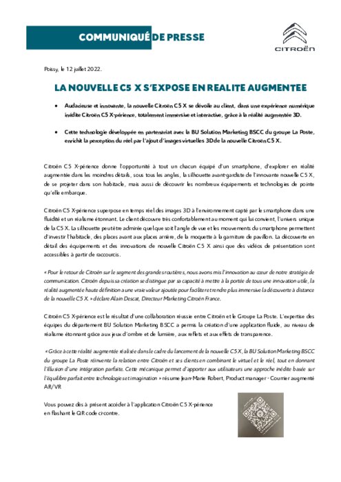 Citroën C5 X-périence donne l’opportunité à tout un chacun équipé d’un smartphone, d’explorer en réalité augmentée dans les moindres détails, sous tous les angles, la silhouette avant-gardiste de l’innovante nouvelle C5 X, de se projeter dans son habitacle, mais aussi de découvrir les nombreux équipements et technologies de pointe qu’elle embarque.