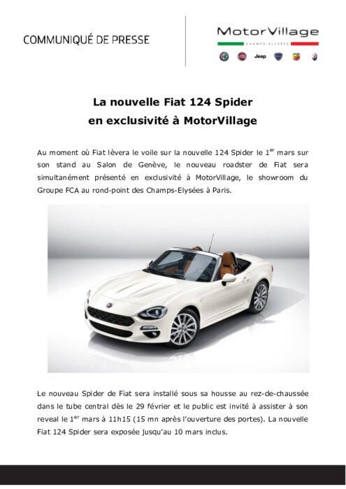 Au moment où Fiat lèvera le voile sur la nouvelle 124 Spider le 1er mars sur son stand au Salon de Genève, le nouveau roadster de Fiat sera simultanément présenté en exclusivité à MotorVillage, le showroom du Groupe FCA au rond-point des Champs-Elysées à Paris.