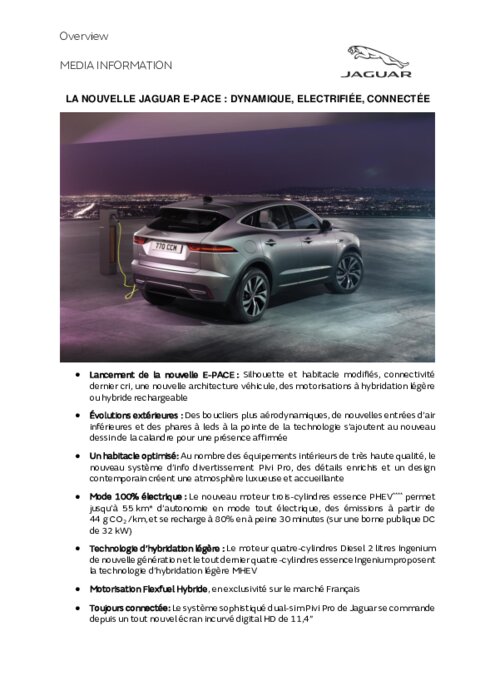 Constructeurs 28 octobre 2020 - 10:57 Lancement de la nouvelle E-PACE : Silhouette et habitacle modifiés, connectivité dernier cri, une nouvelle architecture véhicule, et des motorisations à hybridation légère, hybride rechargeable et Flexfuel Hybride PDF (519 Ko) Télécharger