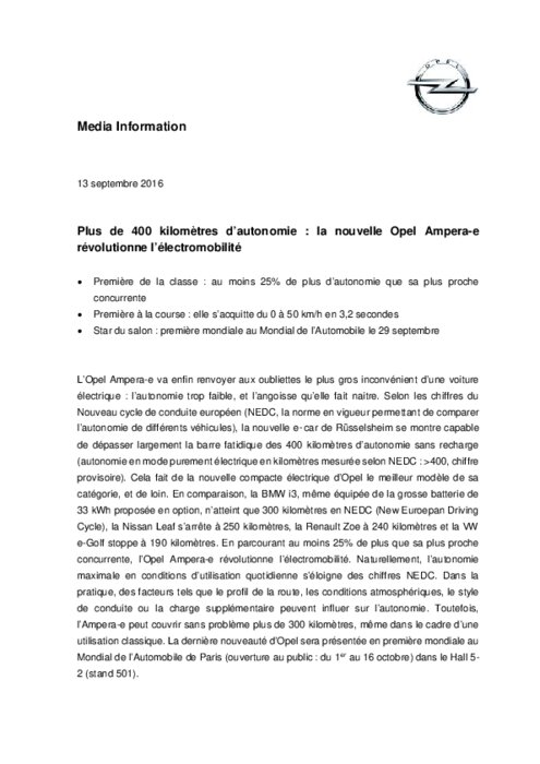 La nouvelle Opel Ampera-e dépasse les 400 km d'autonomie