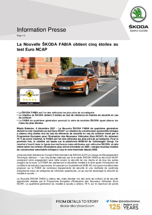 La Nouvelle ŠKODA FABIA de quatrième génération obtient la note maximale au test Euro NCAP. La citadine du constructeur automobile tchèque a obtenu cinq étoiles lors du test de référence de sécurité en cas de collision mené par le Programme Européen pour l'Evaluation des Nouveaux Véhicules (Euro NCAP). En obtenant 78 % du score maximal, la FABIA est l'un des véhicules les plus sûrs de sa catégorie. Pour la première fois, la citadine est basée sur la plateforme MQB-A0 de Volkswagen Group...