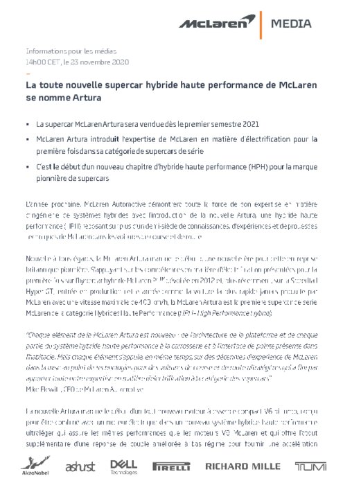 L'année prochaine, McLaren Automotive démontrera toute la force de son expertise en matière d'ingénierie de systèmes hybrides avec l'introduction de la nouvelle Artura, une hybride haute performance (HPH) reposant sur plus d'un demi-siècle de connaissances, d'expériences et de prouesses techniques de McLaren dans les voitures de course et de route.