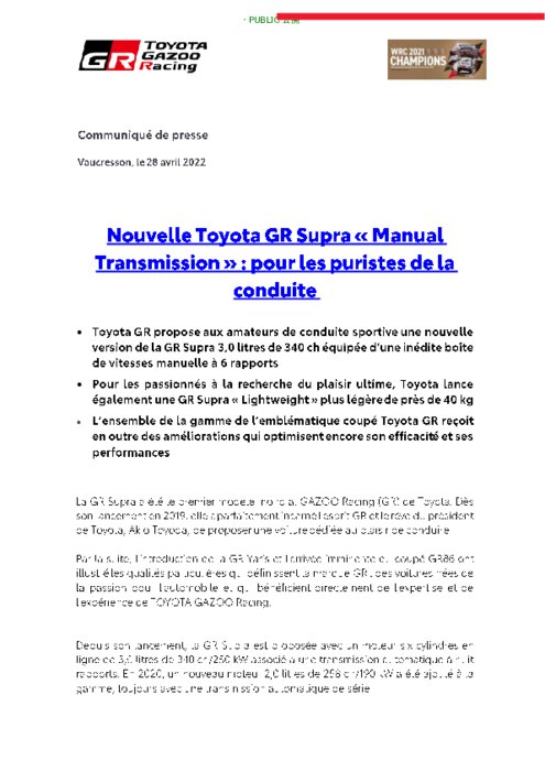 Toyota GR propose aux amateurs de conduite sportive une nouvelle version de la GR Supra 3,0 litres de 340 ch équipée d’une inédite boîte de vitesses manuelle à 6 rapports. Pour les passionnés à la recherche du plaisir ultime, Toyota lance également une GR Supra « Lightweight » plus légère de près de 40 kg. L’ensemble de la gamme de l’emblématique coupé Toyota GR reçoit en outre des améliorations qui optimisent encore son efficacité et ses performances.