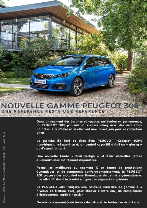Dans un segment des berlines compactes qui évolue en permanence, la PEUGEOT 308 poursuit sa success story avec des évolutions notables. Elle s’offre naturellement une mise à jour pour sa collection 2020. La planche de bord se dote d’un PEUGEOT i-Cockpit® 100% numérique ainsi que d’un écran central capacitif à finition " glossy " ou d’aspect brillant. Une nouvelle teinte " bleu vertigo " et deux nouvelles jantes aluminium sont maintenant disponibles.