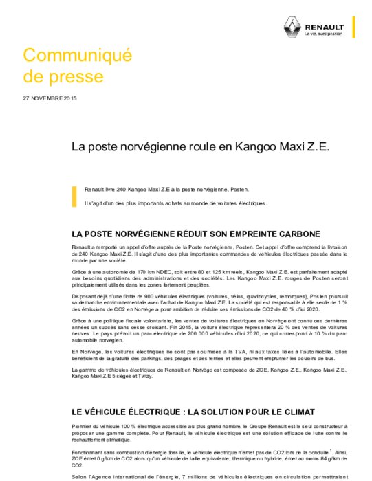 Renault a remporté un appel d’offre auprès de la Poste norvégienne, Posten. Cet appel d’offre comprend la livraison de 240 Kangoo Maxi Z.E. Il s’agit d’une des plus importantes commandes de véhicules électriques passée dans le monde par une société. Grâce à une autonomie de 170 km NDEC, soit entre 80 et 125 km réels, Kangoo Maxi Z.E. est parfaitement adapté aux besoins quotidiens des administrations et des sociétés.