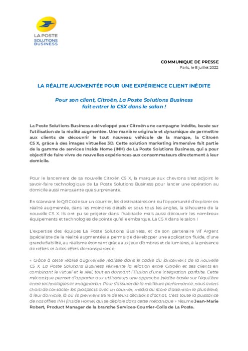 La Poste Solutions Business a développé pour Citroën une campagne inédite, basée sur l’utilisation de la réalité augmentée. Une manière originale et dynamique de permettre aux clients de découvrir le tout nouveau véhicule de la marque, la Citroën C5 X, grâce à des images virtuelles 3D. Cette solution marketing immersive fait partie de la gamme de services Inside Home (INH) de La Poste Solutions Business, qui a pour objectif de faire vivre de nouvelles expériences aux consommateurs.