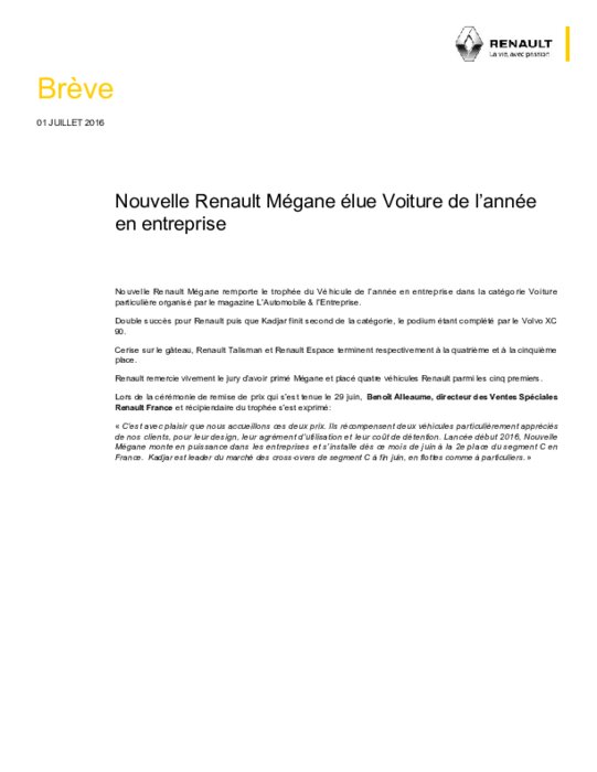 Nouvelle Renault Mégane remporte le trophée du Véhicule de l’année en entreprise dans la catégorie Voiture particulière organisé par le magazine L’Automobile & l’Entreprise. Double succès pour Renault puis que Kadjar finit second de la catégorie, le podium étant complété par le Volvo XC 90. Cerise sur le gâteau, Renault Talisman et Renault Espace terminent respectivement à la quatrième et à la cinquième place.