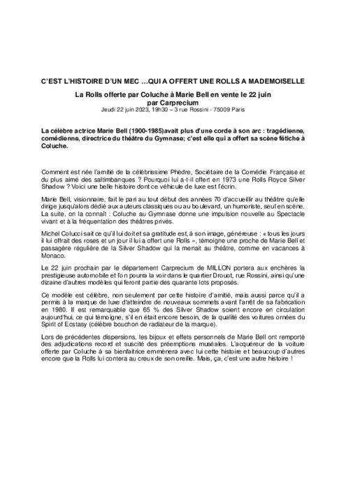 Services 29 mai 2023 - 15:34 Le département Carprecium de Millon portera aux enchères la prestigieuse automobile et l’on pourra la voir dans le quartier Drouot, rue Rossini, ainsi qu’une dizaine d’autres modèles qui feront partie des quarante lots proposés. PDF (127 Ko) Télécharger