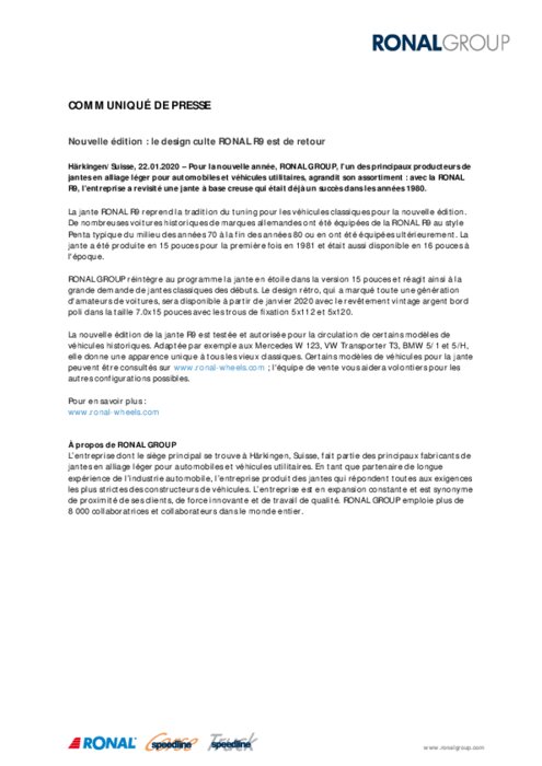 Pour la nouvelle année, RONAL GROUP, l'un des principaux producteurs de jantes en alliage léger pour automobiles et véhicules utilitaires, agrandit son assortiment : avec la RONAL R9, l'entreprise a revisité une jante à base creuse qui était déjà un succès dans les années 1980.