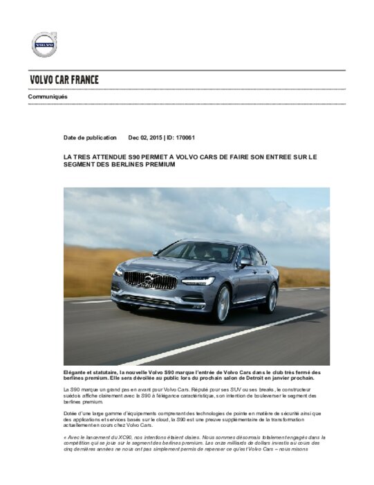Elégante et statutaire, la nouvelle Volvo S90 marque l’entrée de Volvo Cars dans le club très fermé des berlines premium. Elle sera dévoilée au public lors du prochain salon de Detroit en janvier prochain. La S90 marque un grand pas en avant pour Volvo Cars. Réputé pour ses SUV ou ses breaks, le constructeur suédois affiche clairement avec la S90 à l’élégance caractéristique, son intention de bouleverser le segment des berlines premium.