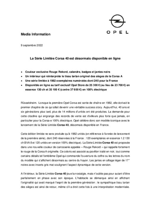 Lorsque la première Opel Corsa est sortie de chaîne en 1982, elle écrivait le premier chapitre de ce qui allait devenir une véritable success story. Aujourd’hui, 40 ans et six générations plus tard, plus de 14 millions d’unités ont été produites. La demande pour cette citadine qui engrange des records de vente est d’ailleurs plus forte que jamais, en particulier pour la Corsa-e 100% électrique. Opel célèbre donc son modèle iconique avec le lancement de la Série Limitée Corsa 40.