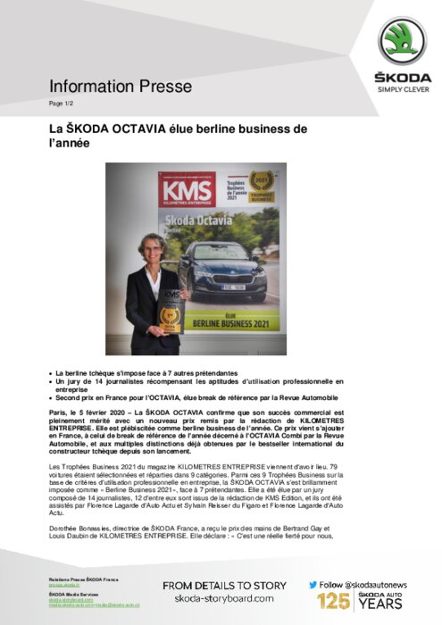 La ŠKODA OCTAVIA confirme que son succès commercial est pleinement mérité avec un nouveau prix remis par la rédaction de KILOMETRES ENTREPRISE. Elle est plébiscitée comme berline business de l’année. Ce prix vient s’ajouter en France, à celui de break de référence de l’année décerné à l’OCTAVIA Combi par la Revue Automobile, et aux multiples distinctions déjà obtenues par le bestseller international du constructeur tchèque depuis son lancement.
