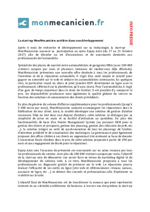 Après 6 mois de recherche et développement sur sa technologie, la start-up MonMecanicien annonce sa participation au salon Equip Auto (du 17 au 21 Octobre 2017) afin de dévoiler un lot d’innovations et de nouveautés destinées aux professionnels de l'automobile.