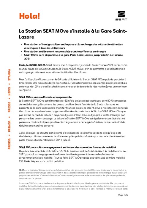 SEAT France met à disposition jusqu’à la fin de l’année 2021, sur le parvis cour du Havre de la Gare St Lazare, la Station SEAT MOve, afin de permettre aux utilisateurs de recharger gratuitement leurs vélos et trottinettes électriques. Pour l’utiliser, il suffit de scanner le QR code affiché sur la Station SEAT MOve puis de procéder à l’inscription. Une fois cette dernière effectuée, l’utilisateur pourra consulter les places disponibles en temps réel (24 au total) et choisir son créneau...